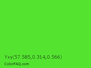Yxy 57.585,0.314,0.566 Color is a normal green color and the nearest color is Harlequin Green #46cb18. Hex code #54e430 and RGB value is rgb(84,228,48). In RGB color space, this color is composed of 33% red, 89% green, 19% blue, In CMYK color space, this color is composed of 63% cyan, 0% magenta, 79% yellow , 11% black , In HSL color space, this color has a hue angle of 108° , 77% saturation and 54% lightness.