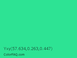 Yxy 57.634,0.263,0.447 Color is a normal green color and the nearest color is Shamrock #33cc99. Hex code #2de394 and RGB value is rgb(45,227,148). In RGB color space, this color is composed of 18% red, 89% green, 58% blue, In CMYK color space, this color is composed of 80% cyan, 0% magenta, 35% yellow , 11% black , In HSL color space, this color has a hue angle of 154° , 76% saturation and 53% lightness.