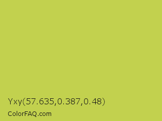 Yxy 57.635,0.387,0.48 Color is a normal yellow color and the nearest color is June Bud #bdda57. Hex code #c2d14e and RGB value is rgb(194,209,78). In RGB color space, this color is composed of 76% red, 82% green, 31% blue, In CMYK color space, this color is composed of 7% cyan, 0% magenta, 63% yellow , 18% black , In HSL color space, this color has a hue angle of 67° , 59% saturation and 56% lightness.