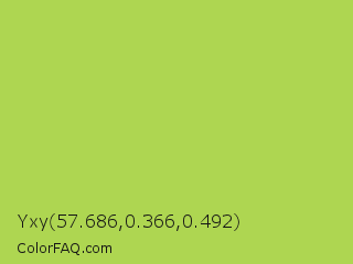 Yxy 57.686,0.366,0.492 Color is a normal lime color and the nearest color is Conifer #acdd4d. Hex code #aed651 and RGB value is rgb(174,214,81). In RGB color space, this color is composed of 68% red, 84% green, 32% blue, In CMYK color space, this color is composed of 19% cyan, 0% magenta, 62% yellow , 16% black , In HSL color space, this color has a hue angle of 78° , 62% saturation and 58% lightness.