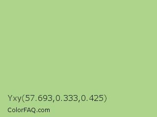 Yxy 57.693,0.333,0.425 Color is a light green color and the nearest color is Feijoa #9fdd8c. Hex code #acd48a and RGB value is rgb(172,212,138). In RGB color space, this color is composed of 67% red, 83% green, 54% blue, In CMYK color space, this color is composed of 19% cyan, 0% magenta, 35% yellow , 17% black , In HSL color space, this color has a hue angle of 92° , 46% saturation and 69% lightness.