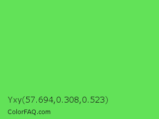Yxy 57.694,0.308,0.523 Color is a light green color and the nearest color is Screamin Green #66ff66. Hex code #62e258 and RGB value is rgb(98,226,88). In RGB color space, this color is composed of 38% red, 89% green, 35% blue, In CMYK color space, this color is composed of 57% cyan, 0% magenta, 61% yellow , 11% black , In HSL color space, this color has a hue angle of 116° , 70% saturation and 62% lightness.