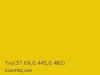 Yxy 57.69,0.445,0.483 Color is a normal yellow color and the nearest color is Corn #e7bf05. Hex code #e6c709 and RGB value is rgb(230,199,9). In RGB color space, this color is composed of 90% red, 78% green, 4% blue, In CMYK color space, this color is composed of 0% cyan, 13% magenta, 96% yellow , 10% black , In HSL color space, this color has a hue angle of 52° , 92% saturation and 47% lightness.