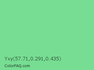 Yxy 57.71,0.291,0.435 Color is a light green color and the nearest color is Very Light Malachite Green #64e986. Hex code #76dd92 and RGB value is rgb(118,221,146). In RGB color space, this color is composed of 46% red, 87% green, 57% blue, In CMYK color space, this color is composed of 47% cyan, 0% magenta, 34% yellow , 13% black , In HSL color space, this color has a hue angle of 136° , 60% saturation and 66% lightness.