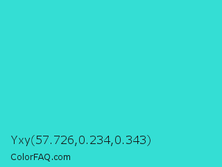 Yxy 57.726,0.234,0.343 Color is a normal cyan color and the nearest color is Turquoise #40e0d0. Hex code #34ded4 and RGB value is rgb(52,222,212). In RGB color space, this color is composed of 20% red, 87% green, 83% blue, In CMYK color space, this color is composed of 77% cyan, 0% magenta, 5% yellow , 13% black , In HSL color space, this color has a hue angle of 176° , 72% saturation and 54% lightness.