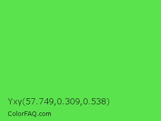 Yxy 57.749,0.309,0.538 Color is a normal green color and the nearest color is Screamin Green #66ff66. Hex code #5be34d and RGB value is rgb(91,227,77). In RGB color space, this color is composed of 36% red, 89% green, 30% blue, In CMYK color space, this color is composed of 60% cyan, 0% magenta, 66% yellow , 11% black , In HSL color space, this color has a hue angle of 114° , 73% saturation and 60% lightness.