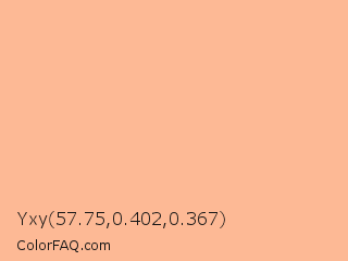 Yxy 57.75,0.402,0.367 Color is a light orange color and the nearest color is Macaroni And Cheese #ffbd88. Hex code #fdb995 and RGB value is rgb(253,185,149). In RGB color space, this color is composed of 99% red, 73% green, 58% blue, In CMYK color space, this color is composed of 0% cyan, 27% magenta, 41% yellow , 1% black , In HSL color space, this color has a hue angle of 21° , 96% saturation and 79% lightness.