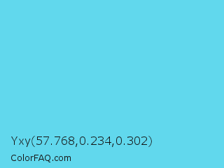 Yxy 57.768,0.234,0.302 Color is a light cyan color and the nearest color is Turquoise Blue #6cdae7. Hex code #61d8ed and RGB value is rgb(97,216,237). In RGB color space, this color is composed of 38% red, 85% green, 93% blue, In CMYK color space, this color is composed of 59% cyan, 9% magenta, 0% yellow , 7% black , In HSL color space, this color has a hue angle of 189° , 80% saturation and 65% lightness.