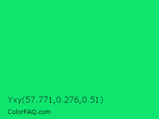 Yxy 57.771,0.276,0.51 Color is a normal green color and the nearest color is Malachite #0bda51. Hex code #0ee66e and RGB value is rgb(14,230,110). In RGB color space, this color is composed of 5% red, 90% green, 43% blue, In CMYK color space, this color is composed of 94% cyan, 0% magenta, 52% yellow , 10% black , In HSL color space, this color has a hue angle of 147° , 89% saturation and 48% lightness.