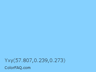 Yxy 57.807,0.239,0.273 Color is a light blue color and the nearest color is Light Sky Blue #87cefa. Hex code #85d1ff and RGB value is rgb(133,209,255). In RGB color space, this color is composed of 52% red, 82% green, 100% blue, In CMYK color space, this color is composed of 48% cyan, 18% magenta, 0% yellow , 0% black , In HSL color space, this color has a hue angle of 203° , 100% saturation and 76% lightness.