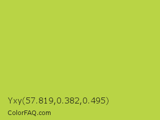 Yxy 57.819,0.382,0.495 Color is a normal lime color and the nearest color is Conifer #acdd4d. Hex code #b9d445 and RGB value is rgb(185,212,69). In RGB color space, this color is composed of 73% red, 83% green, 27% blue, In CMYK color space, this color is composed of 13% cyan, 0% magenta, 67% yellow , 17% black , In HSL color space, this color has a hue angle of 71° , 62% saturation and 55% lightness.
