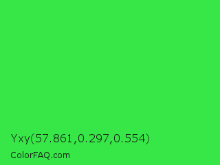 Yxy 57.861,0.297,0.554 Color is a normal green color and the nearest color is Lime Green #32cd32. Hex code #37e647 and RGB value is rgb(55,230,71). In RGB color space, this color is composed of 22% red, 90% green, 28% blue, In CMYK color space, this color is composed of 76% cyan, 0% magenta, 69% yellow , 10% black , In HSL color space, this color has a hue angle of 125° , 78% saturation and 56% lightness.