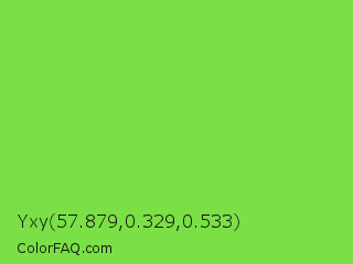 Yxy 57.879,0.329,0.533 Color is a normal green color and the nearest color is Kiwi #8ee53f. Hex code #7ae045 and RGB value is rgb(122,224,69). In RGB color space, this color is composed of 48% red, 88% green, 27% blue, In CMYK color space, this color is composed of 46% cyan, 0% magenta, 69% yellow , 12% black , In HSL color space, this color has a hue angle of 99° , 71% saturation and 57% lightness.