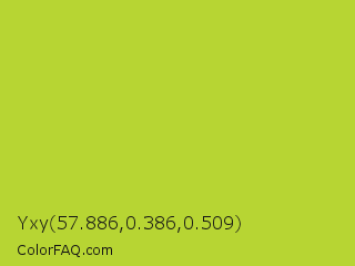 Yxy 57.886,0.386,0.509 Color is a normal lime color and the nearest color is Key Lime Pie #bfc921. Hex code #b7d533 and RGB value is rgb(183,213,51). In RGB color space, this color is composed of 72% red, 84% green, 20% blue, In CMYK color space, this color is composed of 14% cyan, 0% magenta, 76% yellow , 16% black , In HSL color space, this color has a hue angle of 71° , 66% saturation and 52% lightness.