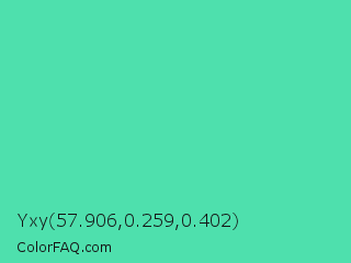 Yxy 57.906,0.259,0.402 Color is a normal green color and the nearest color is Eucalyptus #44d7a8. Hex code #4ee0ad and RGB value is rgb(78,224,173). In RGB color space, this color is composed of 31% red, 88% green, 68% blue, In CMYK color space, this color is composed of 65% cyan, 0% magenta, 23% yellow , 12% black , In HSL color space, this color has a hue angle of 159° , 70% saturation and 59% lightness.