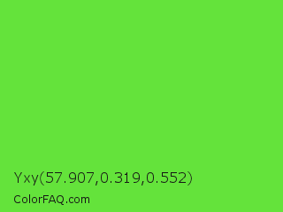 Yxy 57.907,0.319,0.552 Color is a normal green color and the nearest color is Kiwi #8ee53f. Hex code #64e33b and RGB value is rgb(100,227,59). In RGB color space, this color is composed of 39% red, 89% green, 23% blue, In CMYK color space, this color is composed of 56% cyan, 0% magenta, 74% yellow , 11% black , In HSL color space, this color has a hue angle of 105° , 75% saturation and 56% lightness.