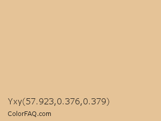 Yxy 57.923,0.376,0.379 Color is a light orange color and the nearest color is Calico #e0c095. Hex code #e5c397 and RGB value is rgb(229,195,151). In RGB color space, this color is composed of 90% red, 76% green, 59% blue, In CMYK color space, this color is composed of 0% cyan, 15% magenta, 34% yellow , 10% black , In HSL color space, this color has a hue angle of 34° , 60% saturation and 75% lightness.