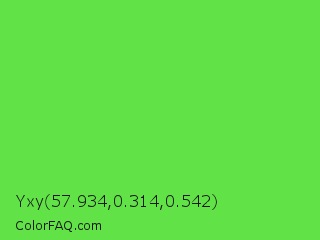Yxy 57.934,0.314,0.542 Color is a normal green color and the nearest color is Screamin Green #66ff66. Hex code #61e347 and RGB value is rgb(97,227,71). In RGB color space, this color is composed of 38% red, 89% green, 28% blue, In CMYK color space, this color is composed of 57% cyan, 0% magenta, 69% yellow , 11% black , In HSL color space, this color has a hue angle of 110° , 74% saturation and 58% lightness.