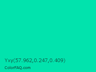 Yxy 57.962,0.247,0.409 Color is a normal cyan color and the nearest color is Medium Spring Green #00fa9a. Hex code #01e3ad and RGB value is rgb(1,227,173). In RGB color space, this color is composed of 0% red, 89% green, 68% blue, In CMYK color space, this color is composed of 100% cyan, 0% magenta, 24% yellow , 11% black , In HSL color space, this color has a hue angle of 166° , 99% saturation and 45% lightness.