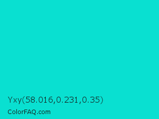 Yxy 58.016,0.231,0.35 Color is a normal cyan color and the nearest color is Bright Turquoise #08e8de. Hex code #09e0d1 and RGB value is rgb(9,224,209). In RGB color space, this color is composed of 4% red, 88% green, 82% blue, In CMYK color space, this color is composed of 96% cyan, 0% magenta, 7% yellow , 12% black , In HSL color space, this color has a hue angle of 176° , 92% saturation and 46% lightness.