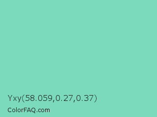 Yxy 58.059,0.27,0.37 Color is a light green color and the nearest color is Bermuda #7dd8c6. Hex code #7bdabc and RGB value is rgb(123,218,188). In RGB color space, this color is composed of 48% red, 85% green, 74% blue, In CMYK color space, this color is composed of 44% cyan, 0% magenta, 14% yellow , 15% black , In HSL color space, this color has a hue angle of 161° , 56% saturation and 67% lightness.