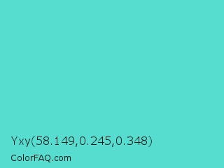 Yxy 58.149,0.245,0.348 Color is a normal cyan color and the nearest color is Medium Turquoise #48d1cc. Hex code #56ddcf and RGB value is rgb(86,221,207). In RGB color space, this color is composed of 34% red, 87% green, 81% blue, In CMYK color space, this color is composed of 61% cyan, 0% magenta, 6% yellow , 13% black , In HSL color space, this color has a hue angle of 174° , 67% saturation and 60% lightness.