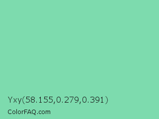 Yxy 58.155,0.279,0.391 Color is a light green color and the nearest color is Vista Blue #8fd6b4. Hex code #7ddbae and RGB value is rgb(125,219,174). In RGB color space, this color is composed of 49% red, 86% green, 68% blue, In CMYK color space, this color is composed of 43% cyan, 0% magenta, 21% yellow , 14% black , In HSL color space, this color has a hue angle of 151° , 57% saturation and 67% lightness.