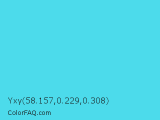 Yxy 58.157,0.229,0.308 Color is a light cyan color and the nearest color is Turquoise #40e0d0. Hex code #4cdbeb and RGB value is rgb(76,219,235). In RGB color space, this color is composed of 30% red, 86% green, 92% blue, In CMYK color space, this color is composed of 68% cyan, 7% magenta, 0% yellow , 8% black , In HSL color space, this color has a hue angle of 186° , 80% saturation and 61% lightness.