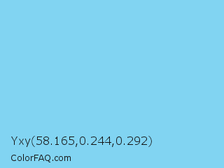Yxy 58.165,0.244,0.292 Color is a light blue color and the nearest color is Pale Cyan #87d3f8. Hex code #81d4f2 and RGB value is rgb(129,212,242). In RGB color space, this color is composed of 51% red, 83% green, 95% blue, In CMYK color space, this color is composed of 47% cyan, 12% magenta, 0% yellow , 5% black , In HSL color space, this color has a hue angle of 196° , 81% saturation and 73% lightness.