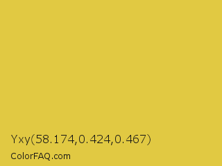 Yxy 58.174,0.424,0.467 Color is a normal yellow color and the nearest color is Wattle #dcd747. Hex code #e1c942 and RGB value is rgb(225,201,66). In RGB color space, this color is composed of 88% red, 79% green, 26% blue, In CMYK color space, this color is composed of 0% cyan, 11% magenta, 71% yellow , 12% black , In HSL color space, this color has a hue angle of 51° , 73% saturation and 57% lightness.