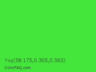 Yxy 58.175,0.305,0.563 Color is a normal green color and the nearest color is Lime Green #32cd32. Hex code #45e63b and RGB value is rgb(69,230,59). In RGB color space, this color is composed of 27% red, 90% green, 23% blue, In CMYK color space, this color is composed of 70% cyan, 0% magenta, 74% yellow , 10% black , In HSL color space, this color has a hue angle of 116° , 77% saturation and 57% lightness.