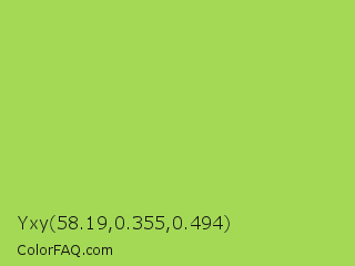 Yxy 58.19,0.355,0.494 Color is a normal green color and the nearest color is Conifer #acdd4d. Hex code #a4d956 and RGB value is rgb(164,217,86). In RGB color space, this color is composed of 64% red, 85% green, 34% blue, In CMYK color space, this color is composed of 24% cyan, 0% magenta, 60% yellow , 15% black , In HSL color space, this color has a hue angle of 84° , 63% saturation and 59% lightness.