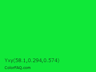 Yxy 58.1,0.294,0.574 Color is a normal green color and the nearest color is Malachite #0bda51. Hex code #0fe838 and RGB value is rgb(15,232,56). In RGB color space, this color is composed of 6% red, 91% green, 22% blue, In CMYK color space, this color is composed of 94% cyan, 0% magenta, 76% yellow , 9% black , In HSL color space, this color has a hue angle of 131° , 88% saturation and 48% lightness.