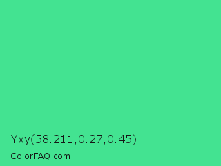 Yxy 58.211,0.27,0.45 Color is a normal green color and the nearest color is Eucalyptus #44d7a8. Hex code #43e391 and RGB value is rgb(67,227,145). In RGB color space, this color is composed of 26% red, 89% green, 57% blue, In CMYK color space, this color is composed of 70% cyan, 0% magenta, 36% yellow , 11% black , In HSL color space, this color has a hue angle of 149° , 74% saturation and 58% lightness.
