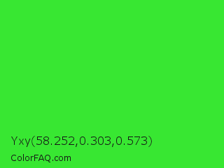 Yxy 58.252,0.303,0.573 Color is a normal green color and the nearest color is Lime Green #32cd32. Hex code #38e732 and RGB value is rgb(56,231,50). In RGB color space, this color is composed of 22% red, 91% green, 20% blue, In CMYK color space, this color is composed of 76% cyan, 0% magenta, 78% yellow , 9% black , In HSL color space, this color has a hue angle of 118° , 79% saturation and 55% lightness.