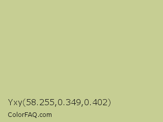 Yxy 58.255,0.349,0.402 Color is a light yellow color and the nearest color is Pine Glade #c7cd90. Hex code #c6ce93 and RGB value is rgb(198,206,147). In RGB color space, this color is composed of 78% red, 81% green, 58% blue, In CMYK color space, this color is composed of 4% cyan, 0% magenta, 29% yellow , 19% black , In HSL color space, this color has a hue angle of 68° , 38% saturation and 69% lightness.
