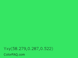 Yxy 58.279,0.287,0.522 Color is a normal green color and the nearest color is UFO Green #3cd070. Hex code #35e663 and RGB value is rgb(53,230,99). In RGB color space, this color is composed of 21% red, 90% green, 39% blue, In CMYK color space, this color is composed of 77% cyan, 0% magenta, 57% yellow , 10% black , In HSL color space, this color has a hue angle of 136° , 78% saturation and 55% lightness.