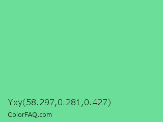 Yxy 58.297,0.281,0.427 Color is a light green color and the nearest color is Medium Aquamarine #66ddaa. Hex code #6bdf9a and RGB value is rgb(107,223,154). In RGB color space, this color is composed of 42% red, 87% green, 60% blue, In CMYK color space, this color is composed of 52% cyan, 0% magenta, 31% yellow , 13% black , In HSL color space, this color has a hue angle of 144° , 64% saturation and 65% lightness.