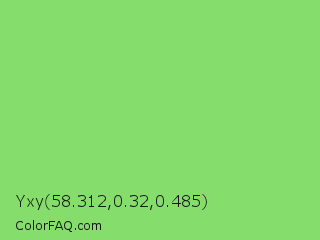 Yxy 58.312,0.32,0.485 Color is a light green color and the nearest color is Pastel Green #77dd77. Hex code #85de6c and RGB value is rgb(133,222,108). In RGB color space, this color is composed of 52% red, 87% green, 42% blue, In CMYK color space, this color is composed of 40% cyan, 0% magenta, 51% yellow , 13% black , In HSL color space, this color has a hue angle of 107° , 63% saturation and 65% lightness.