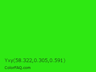 Yxy 58.322,0.305,0.591 Color is a normal green color and the nearest color is Neon Green #39ff14. Hex code #2ee812 and RGB value is rgb(46,232,18). In RGB color space, this color is composed of 18% red, 91% green, 7% blue, In CMYK color space, this color is composed of 80% cyan, 0% magenta, 92% yellow , 9% black , In HSL color space, this color has a hue angle of 112° , 86% saturation and 49% lightness.