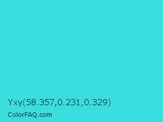 Yxy 58.357,0.231,0.329 Color is a normal cyan color and the nearest color is Turquoise #40e0d0. Hex code #3adede and RGB value is rgb(58,222,222). In RGB color space, this color is composed of 23% red, 87% green, 87% blue, In CMYK color space, this color is composed of 74% cyan, 0% magenta, 0% yellow , 13% black , In HSL color space, this color has a hue angle of 180° , 71% saturation and 55% lightness.