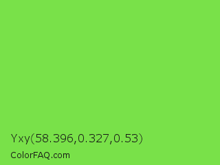 Yxy 58.396,0.327,0.53 Color is a normal green color and the nearest color is Kiwi #8ee53f. Hex code #79e149 and RGB value is rgb(121,225,73). In RGB color space, this color is composed of 47% red, 88% green, 29% blue, In CMYK color space, this color is composed of 46% cyan, 0% magenta, 68% yellow , 12% black , In HSL color space, this color has a hue angle of 101° , 72% saturation and 58% lightness.