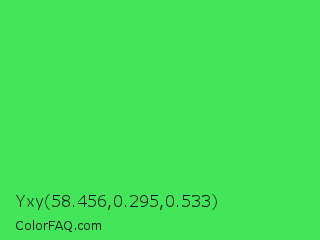 Yxy 58.456,0.295,0.533 Color is a normal green color and the nearest color is UFO Green #3cd070. Hex code #43e658 and RGB value is rgb(67,230,88). In RGB color space, this color is composed of 26% red, 90% green, 35% blue, In CMYK color space, this color is composed of 71% cyan, 0% magenta, 62% yellow , 10% black , In HSL color space, this color has a hue angle of 128° , 77% saturation and 58% lightness.