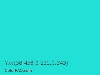 Yxy 58.458,0.231,0.343 Color is a normal cyan color and the nearest color is Turquoise PWG #30d5c8. Hex code #21e0d6 and RGB value is rgb(33,224,214). In RGB color space, this color is composed of 13% red, 88% green, 84% blue, In CMYK color space, this color is composed of 85% cyan, 0% magenta, 4% yellow , 12% black , In HSL color space, this color has a hue angle of 177° , 75% saturation and 50% lightness.