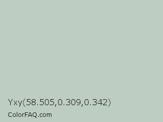 Yxy 58.505,0.309,0.342 Color is a light green color and the nearest color is Powder Ash #bcc9c2. Hex code #becdc2 and RGB value is rgb(190,205,194). In RGB color space, this color is composed of 75% red, 80% green, 76% blue, In CMYK color space, this color is composed of 7% cyan, 0% magenta, 5% yellow , 20% black , In HSL color space, this color has a hue angle of 136° , 13% saturation and 77% lightness.