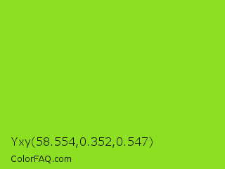 Yxy 58.554,0.352,0.547 Color is a normal green color and the nearest color is Atlantis #97cd2d. Hex code #8ddf22 and RGB value is rgb(141,223,34). In RGB color space, this color is composed of 55% red, 87% green, 13% blue, In CMYK color space, this color is composed of 37% cyan, 0% magenta, 85% yellow , 13% black , In HSL color space, this color has a hue angle of 86° , 75% saturation and 50% lightness.