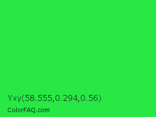 Yxy 58.555,0.294,0.56 Color is a normal green color and the nearest color is Malachite #0bda51. Hex code #27e845 and RGB value is rgb(39,232,69). In RGB color space, this color is composed of 15% red, 91% green, 27% blue, In CMYK color space, this color is composed of 83% cyan, 0% magenta, 70% yellow , 9% black , In HSL color space, this color has a hue angle of 129° , 81% saturation and 53% lightness.