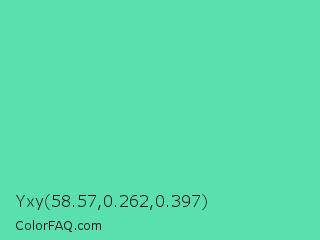 Yxy 58.57,0.262,0.397 Color is a light green color and the nearest color is Medium Aquamarine #66ddaa. Hex code #5ae0b0 and RGB value is rgb(90,224,176). In RGB color space, this color is composed of 35% red, 88% green, 69% blue, In CMYK color space, this color is composed of 60% cyan, 0% magenta, 21% yellow , 12% black , In HSL color space, this color has a hue angle of 159° , 68% saturation and 62% lightness.