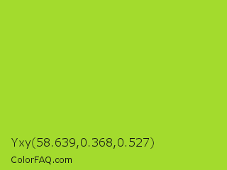 Yxy 58.639,0.368,0.527 Color is a normal lime color and the nearest color is Yellow Green #9acd32. Hex code #a3db2d and RGB value is rgb(163,219,45). In RGB color space, this color is composed of 64% red, 86% green, 18% blue, In CMYK color space, this color is composed of 26% cyan, 0% magenta, 79% yellow , 14% black , In HSL color space, this color has a hue angle of 79° , 71% saturation and 52% lightness.