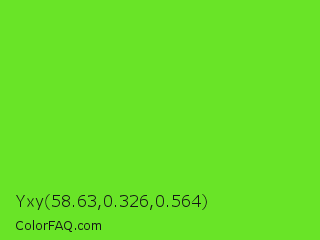 Yxy 58.63,0.326,0.564 Color is a normal green color and the nearest color is Spring Frost #87ff2a. Hex code #69e427 and RGB value is rgb(105,228,39). In RGB color space, this color is composed of 41% red, 89% green, 15% blue, In CMYK color space, this color is composed of 54% cyan, 0% magenta, 83% yellow , 11% black , In HSL color space, this color has a hue angle of 99° , 78% saturation and 52% lightness.